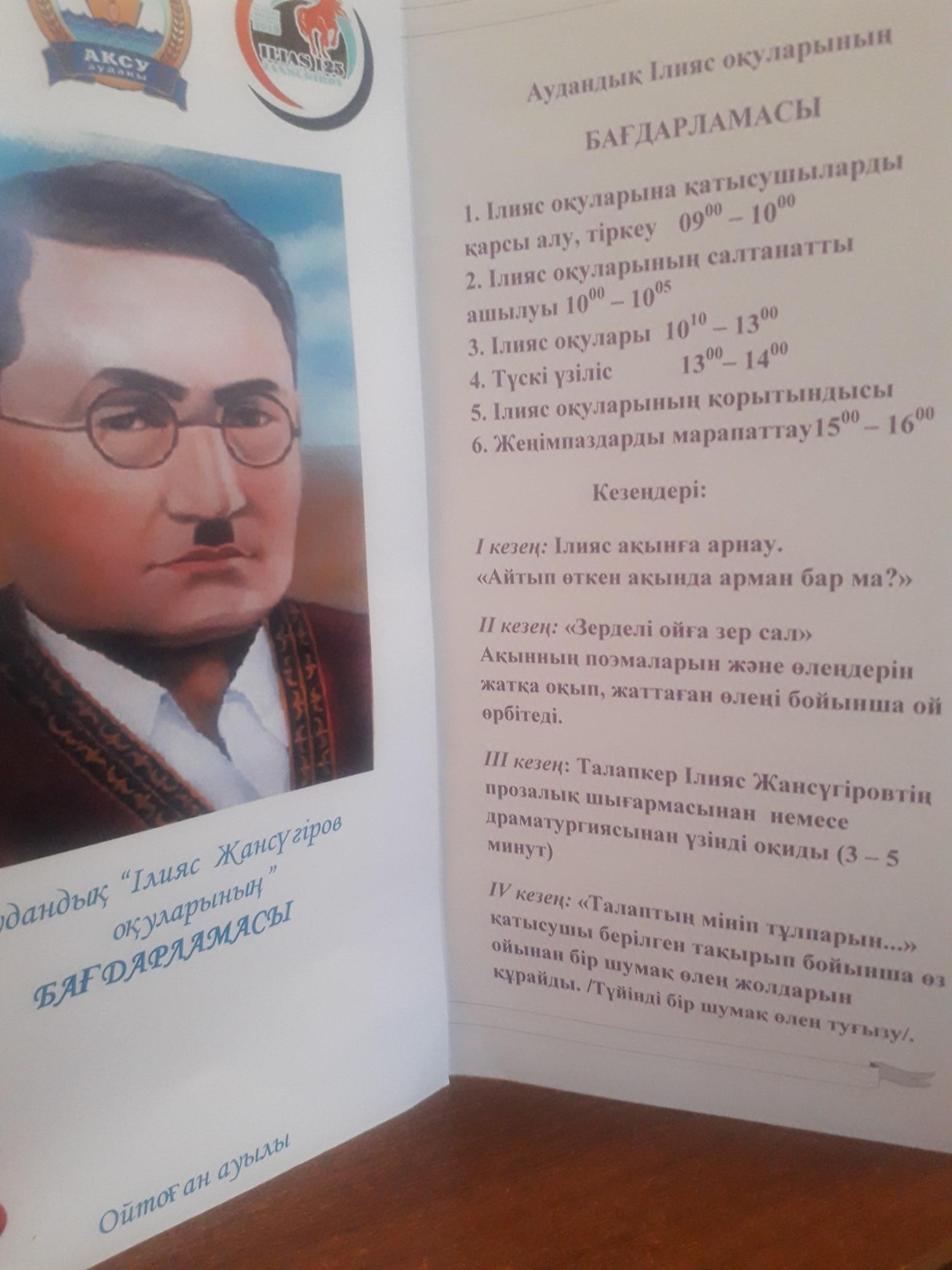 Аудандық «Ілияс оқуы» өз деңгейінде өтіп, әділ- қазылардың әділдігімен қорытындыланды. Қорытынды бойынша сайыста Қ.Сатбаев атындағы мектеп- гимназиясының 10- сынып оқушысы Амангелді Аруна І орынды, Н. Есеболатов атындағы орта мектебінің 10- сынып оқушысы Шындәулет Қарақат және Қ. Терібаев атындағы орта мектебінің 10- сынып оқушысы Райхан Қуантай ІІ орынды, І. Жансүгіров атындағы орта мектебінің 6- сынып оқушысы Жеңісбек Айшат, Ш.Уәлиханов атындағы орта мектебінің 11- сынып оқушысы Шалқар Ақнар мен Жаңатілеу орта мектебінің 9- сынып оқушысы Сейітхан Дина ІІІ орынды иеленді. Сонымен қатар, екі қатысушы номинациямен марапатталды және І. Жансүгіров атындағы орта мектебінің директоры Д.Е. Сағымбаевтың Алғыс хатымен маапатталса аталған мектеп атынан Арнайы жүлдемен Ж.Сыдықов атыдағы орта мектебінің оқушысы Тұрсынбаева Аружан марапатталды.