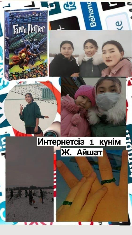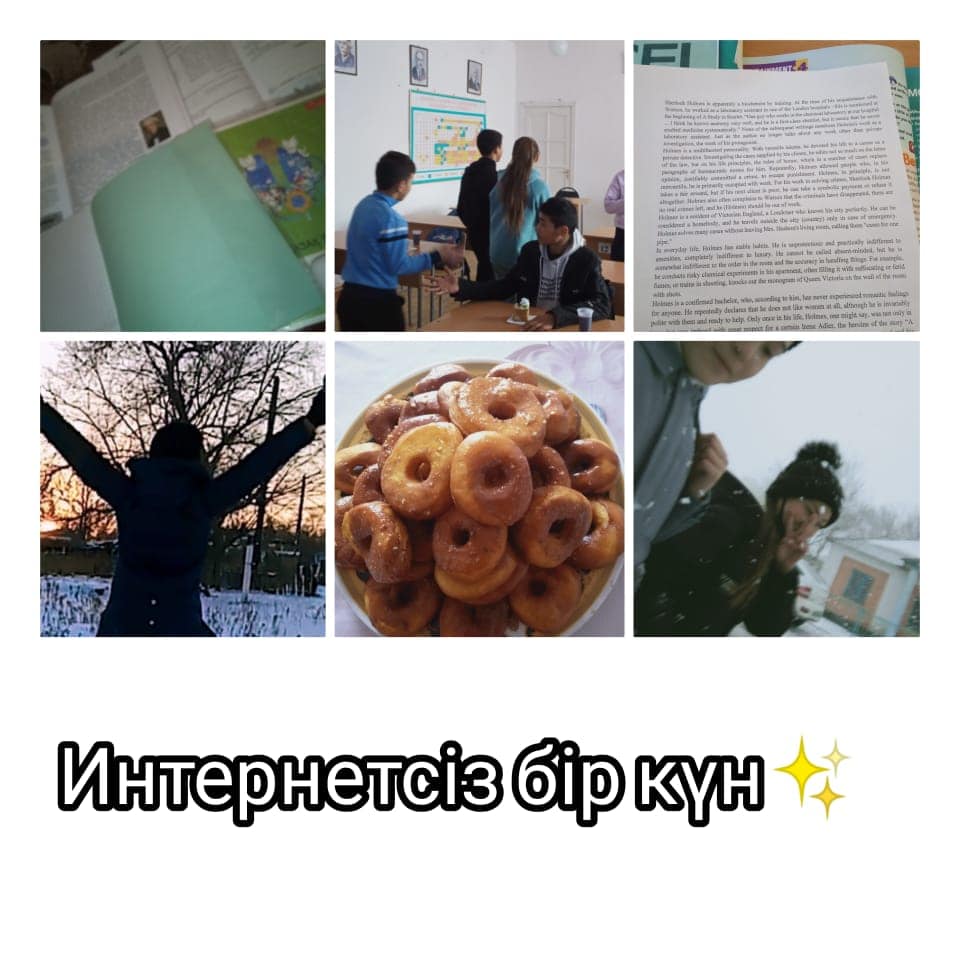 Оқушылардың Интернет белсенділігін бақылауға қатысты интернет-қызметтерді пайдаланушылардың жауапкершілігін, интернет-пайдалану мәдениетін арттыру, интернетке тәуелділіктің алдын алу мақсатында инетрнетсіз күнге арналған мектепішілік «Мен Offline» балалар акциясы ұйымдастырылды.  Акция барысында «Мен интернетсіз бір күнді қалай өткіздім?» тақырыпта 7-10 сыныптар арасында фотоколлаж байқауы өткізілді. 8- сынып оқушыларының фотоколлажы.