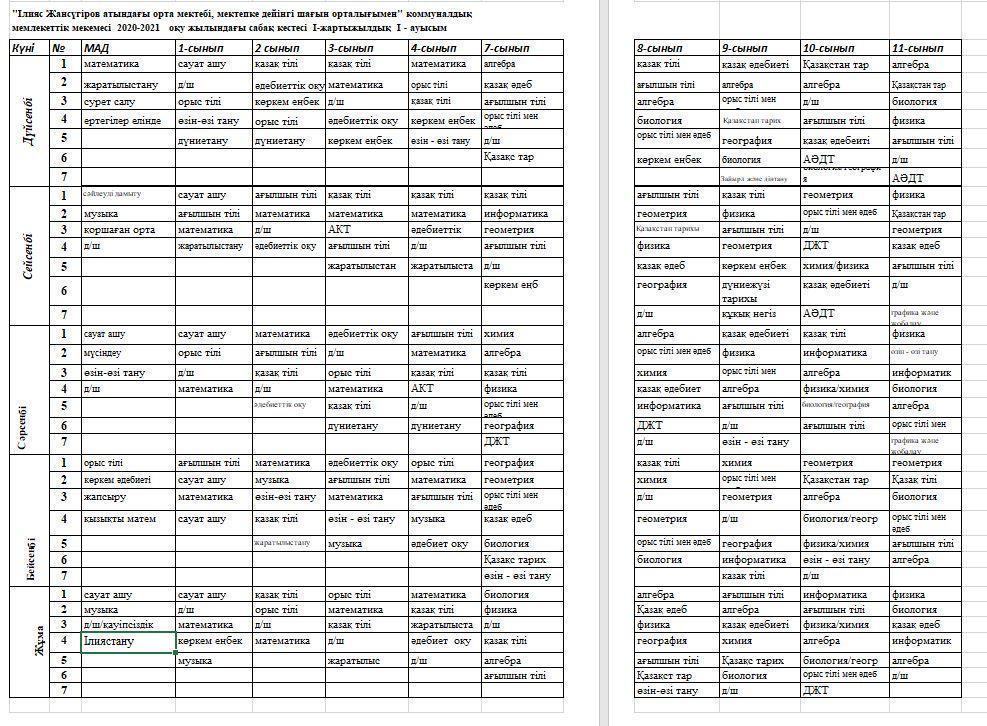 Сабақ кестесі » "Ілияс Жансүгіров атындағы орта мектебі, мектепке дейінгі шағын орталығымен" коммуналдық мемлекеттік мекемесі