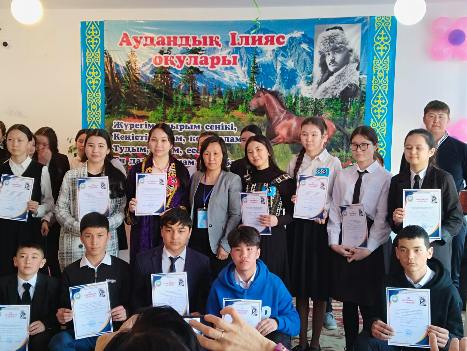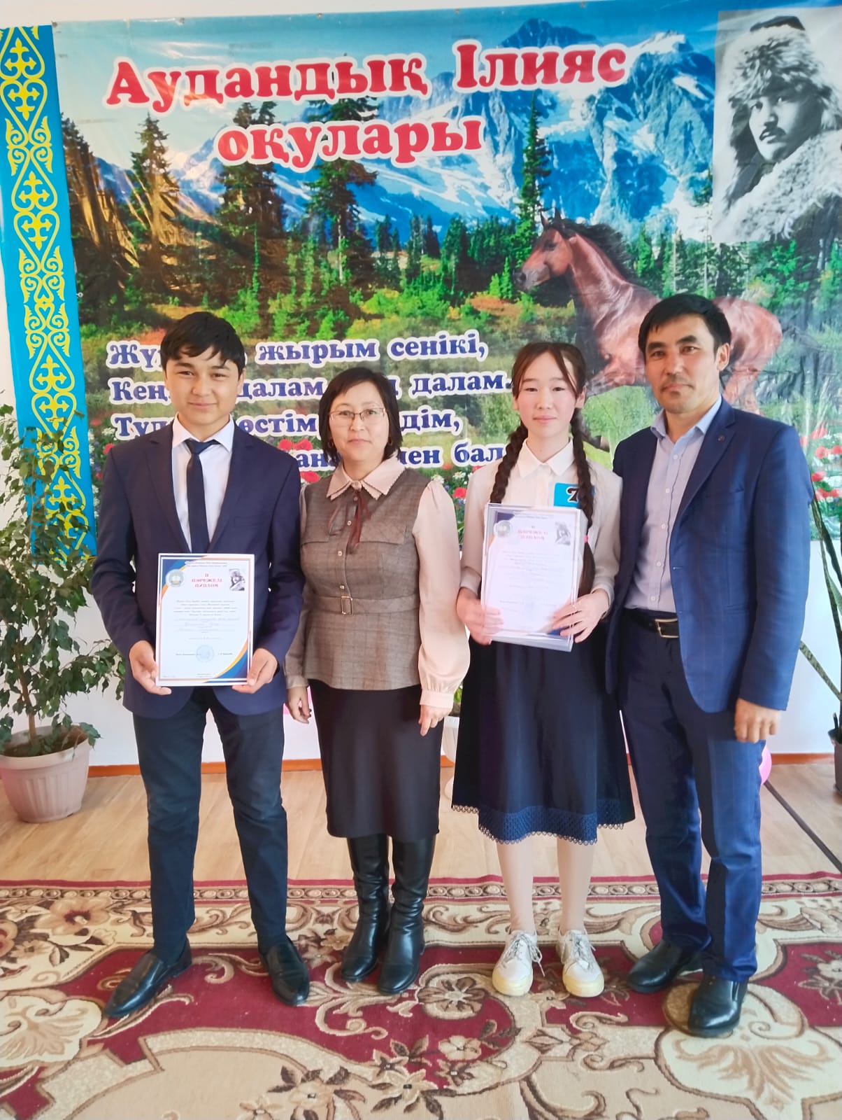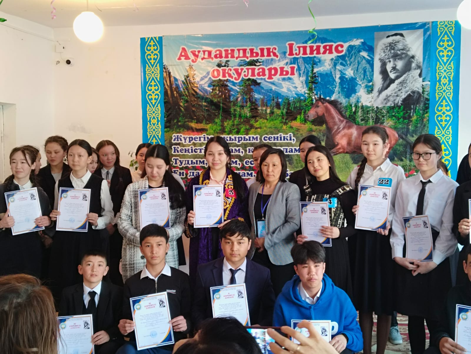 «Ілияс- сөз шебері» кезеңінде І орынды Қ. Сәтбаев атындағы орта мектеп-гимназиясының оқушысы иеленсе, «Ұлы тұлғаға арнау» кезеңінде Н. Есеболатов атындағы орта мектебінің оқушысы І орынға ие болды, «Ілияс –қазақ поэзиясының жыр Құлагері» кезеңі бойынша Е. Жайсаңбаев атындағы орта мектебінің оқушысы І орынға ие болып облыстық кезеңге жолдама алды. Бұл байқауға мектебімізден Ақынға арнау кзеңіне 8 сынып оқушысы Тұрақ Нұрила, Ақынның өлеңдері және поэмасын жатқа мәнерлеп айту бойынша 9 сынып оқушысы Қалқаман Ернұр қатысып, екеуі де  жүлделі ІІ орынға ие болды.