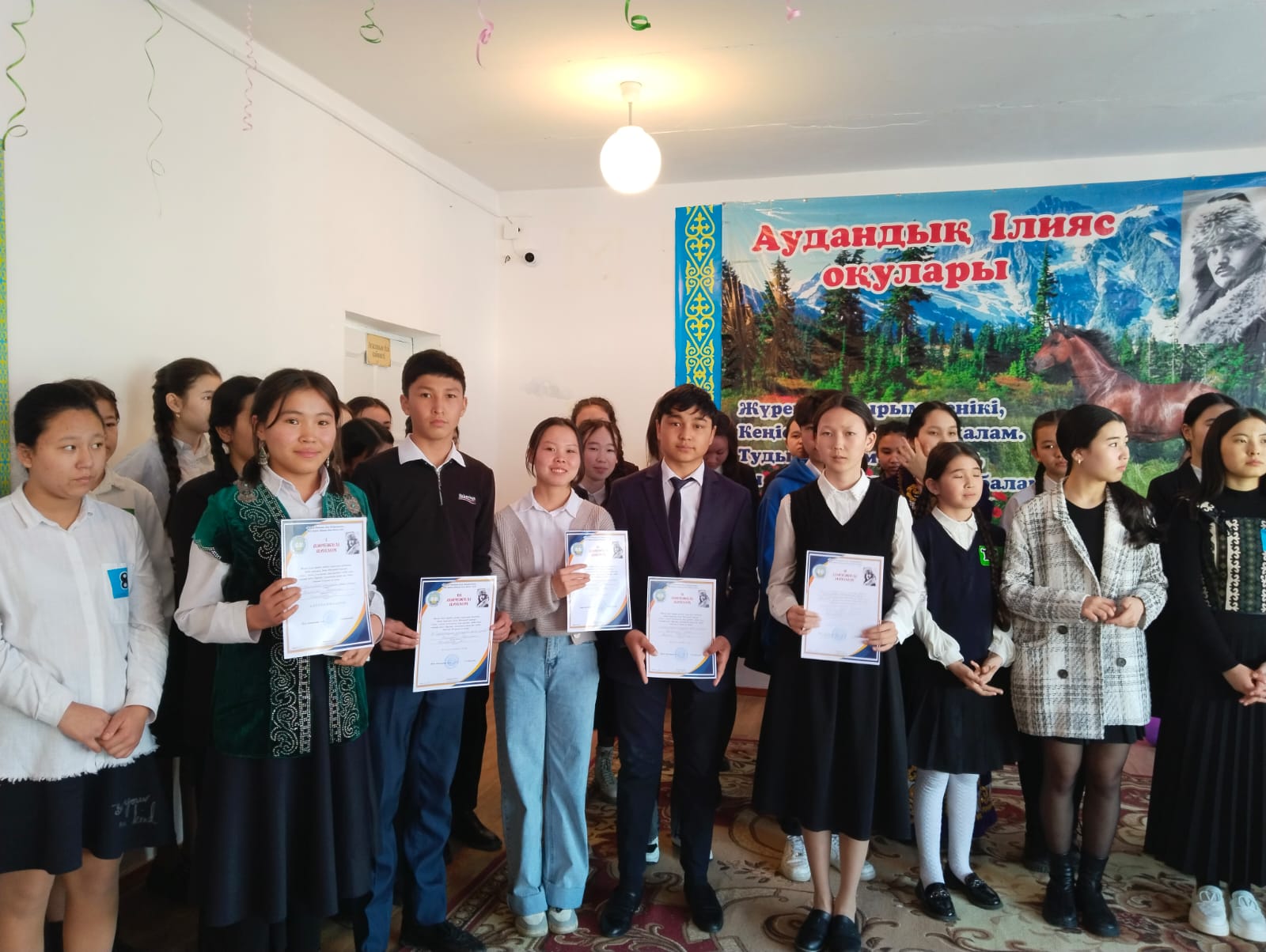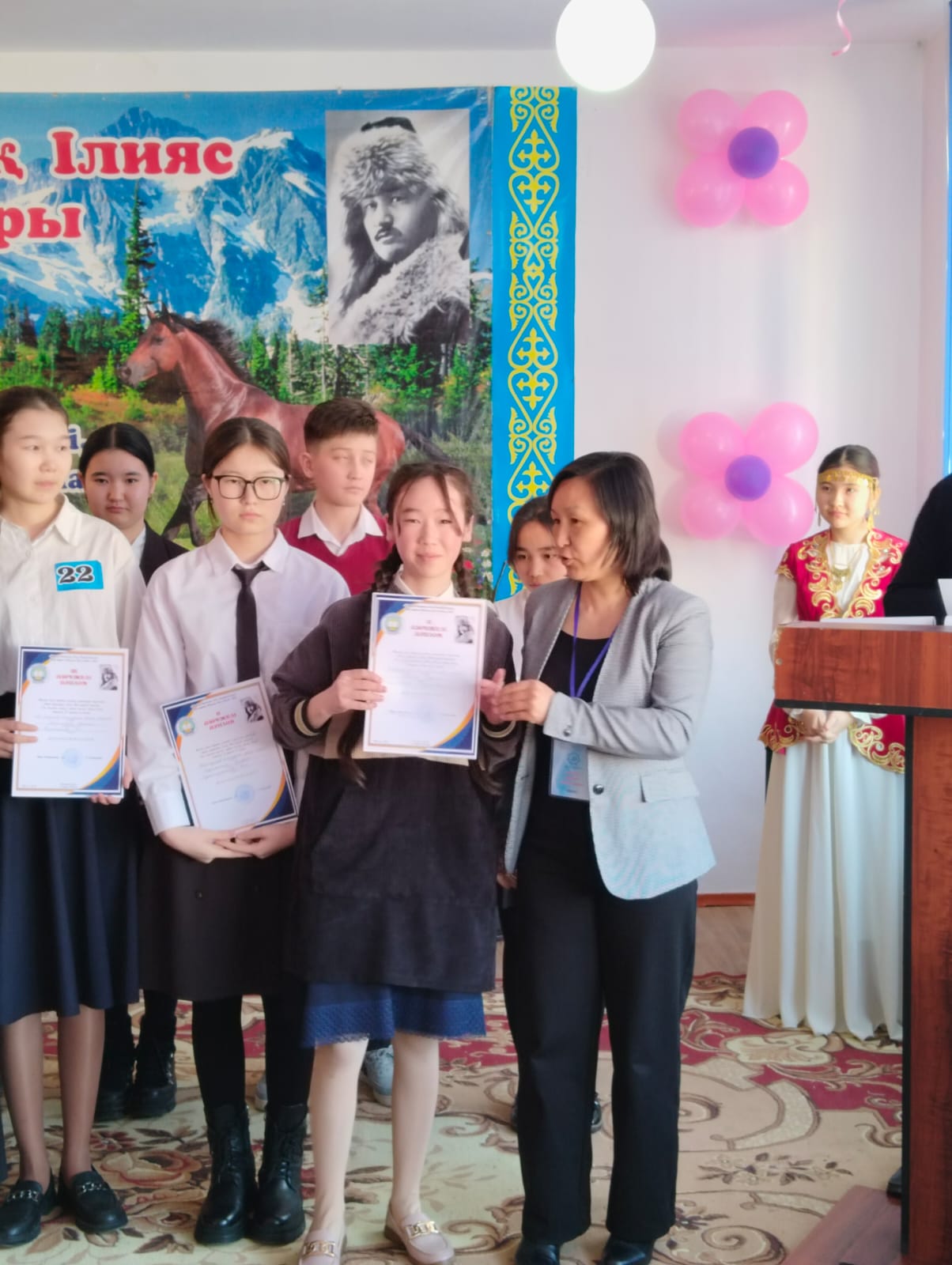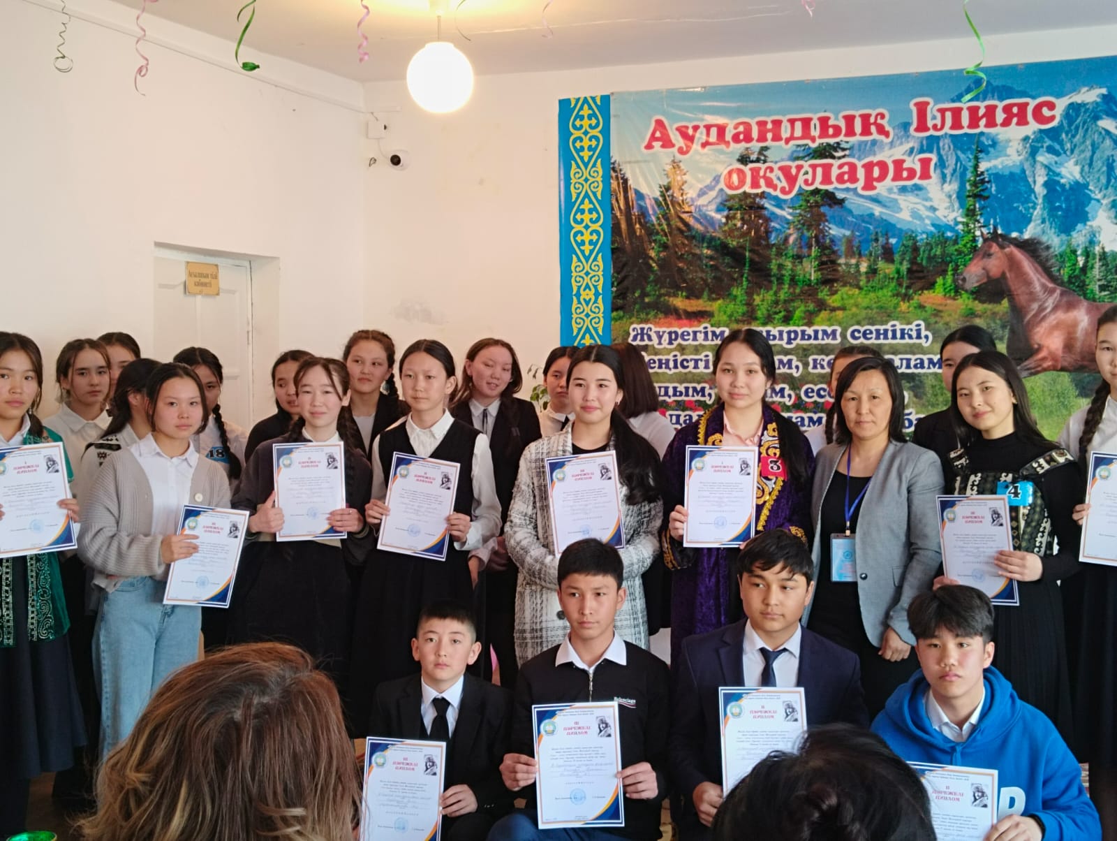 «Ілияс- сөз шебері» кезеңінде І орынды Қ. Сәтбаев атындағы орта мектеп-гимназиясының оқушысы иеленсе, «Ұлы тұлғаға арнау» кезеңінде Н. Есеболатов атындағы орта мектебінің оқушысы І орынға ие болды, «Ілияс –қазақ поэзиясының жыр Құлагері» кезеңі бойынша Е. Жайсаңбаев атындағы орта мектебінің оқушысы І орынға ие болып облыстық кезеңге жолдама алды. Бұл байқауға мектебімізден Ақынға арнау кзеңіне 8 сынып оқушысы Тұрақ Нұрила, Ақынның өлеңдері және поэмасын жатқа мәнерлеп айту бойынша 9 сынып оқушысы Қалқаман Ернұр қатысып, екеуі де  жүлделі ІІ орынға ие болды.