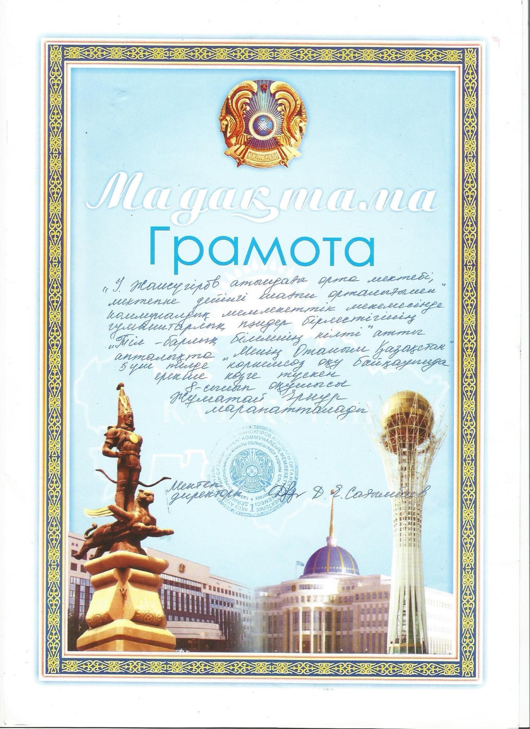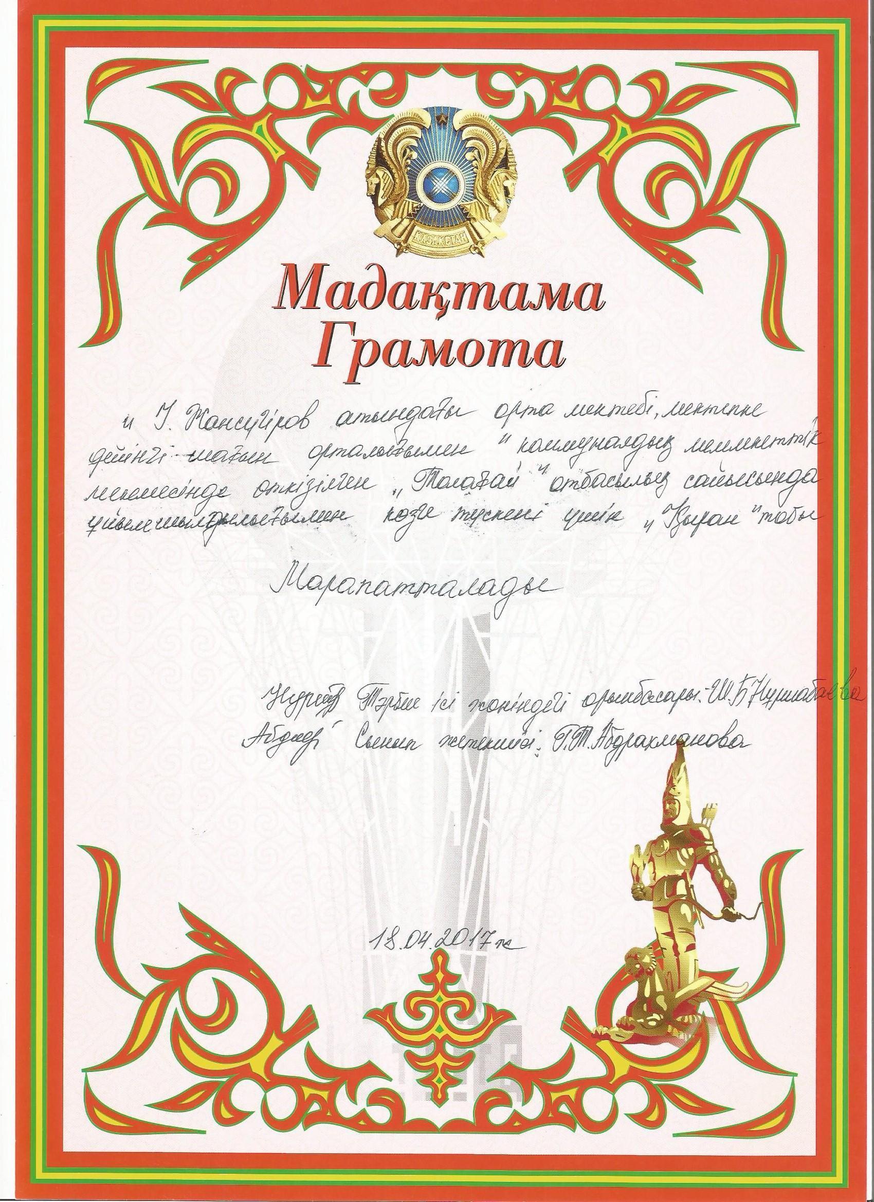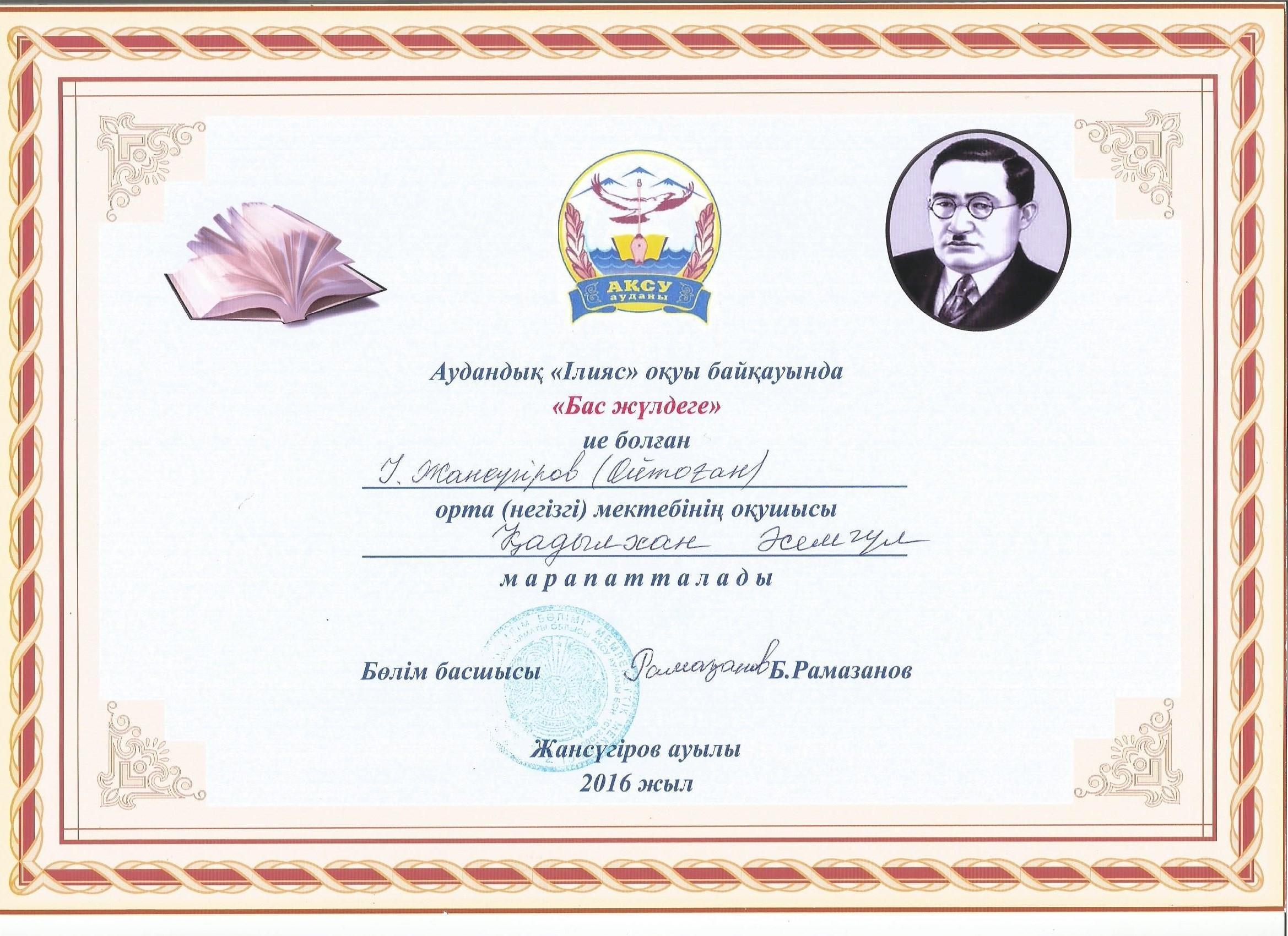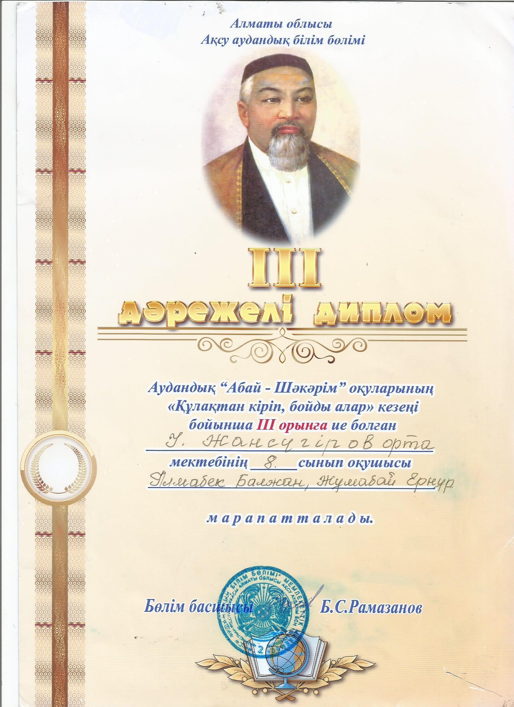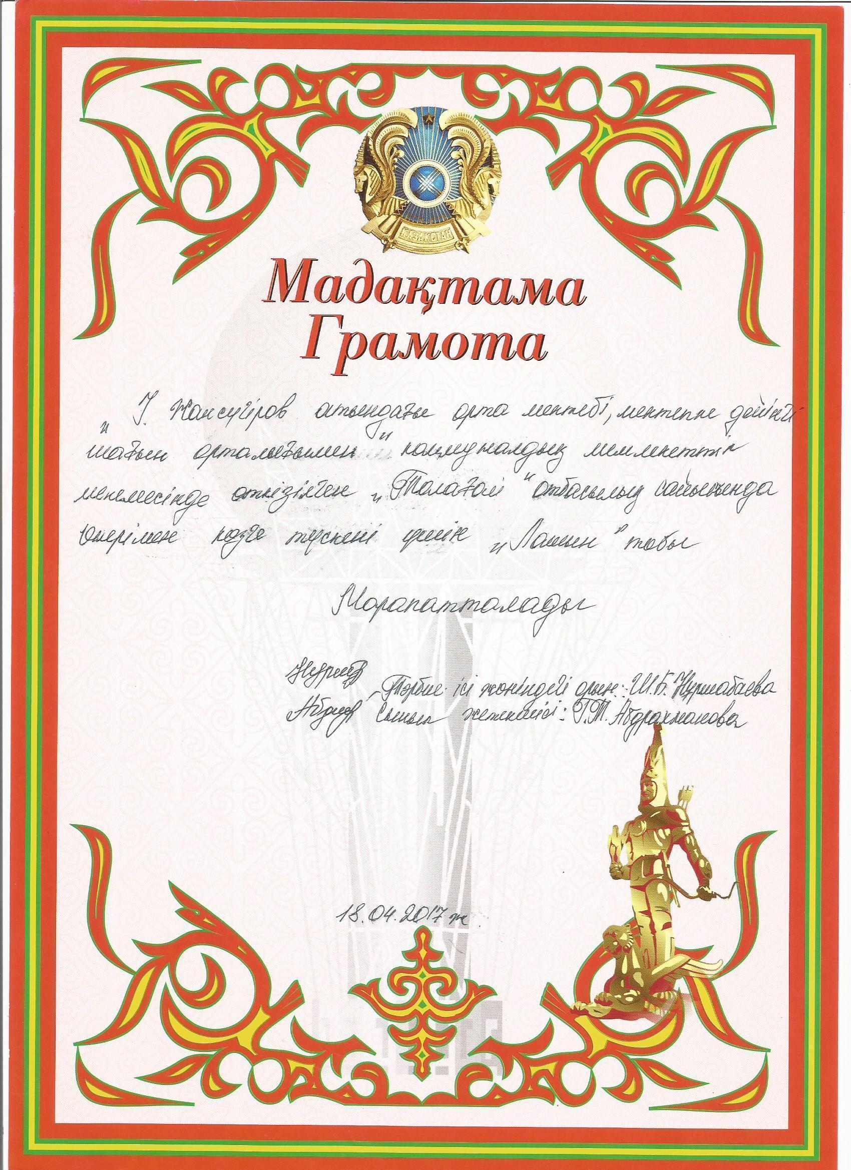 Оқушылар жетістіктері » "Ілияс Жансүгіров атындағы орта мектебі, мектепке дейінгі шағын орталығымен" отдела образования Кербулакского района