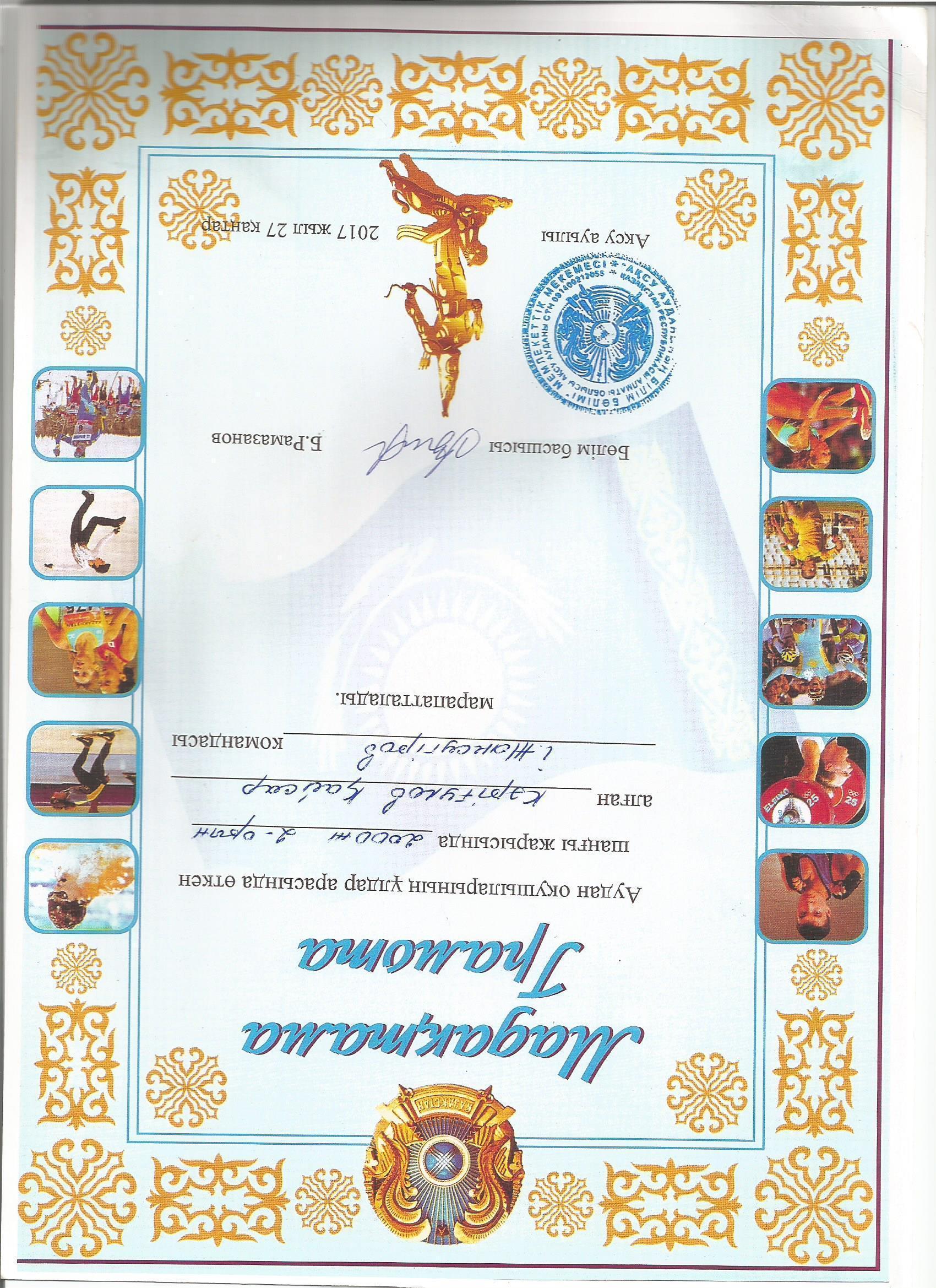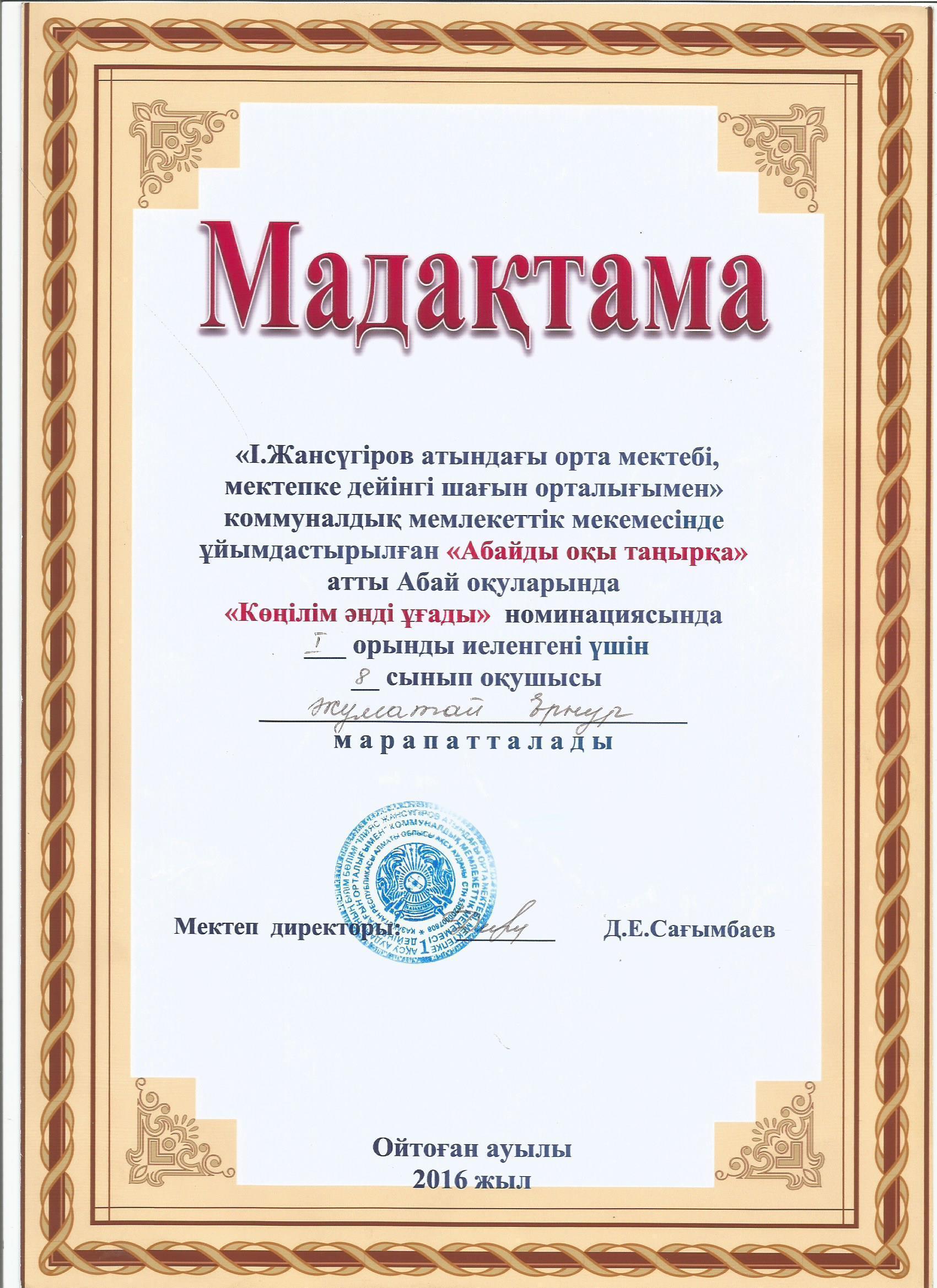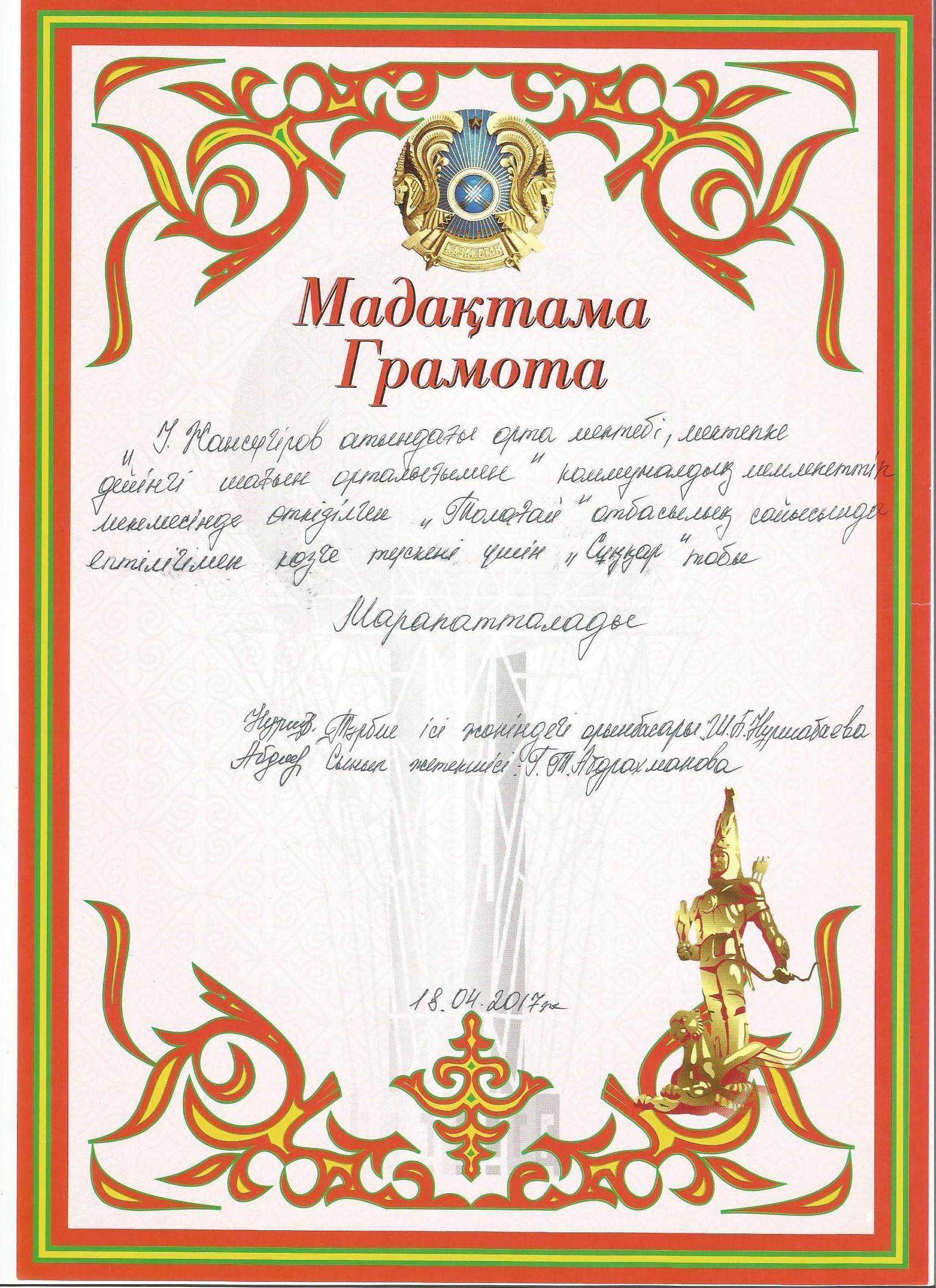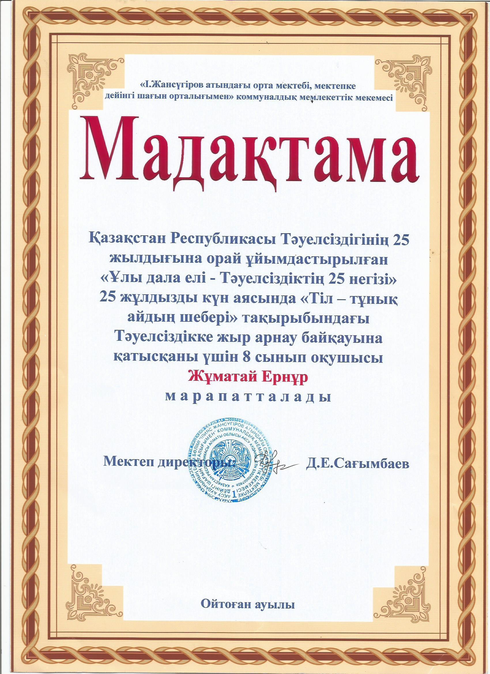 Оқушылар жетістіктері » "Ілияс Жансүгіров атындағы орта мектебі, мектепке дейінгі шағын орталығымен" отдела образования Кербулакского района