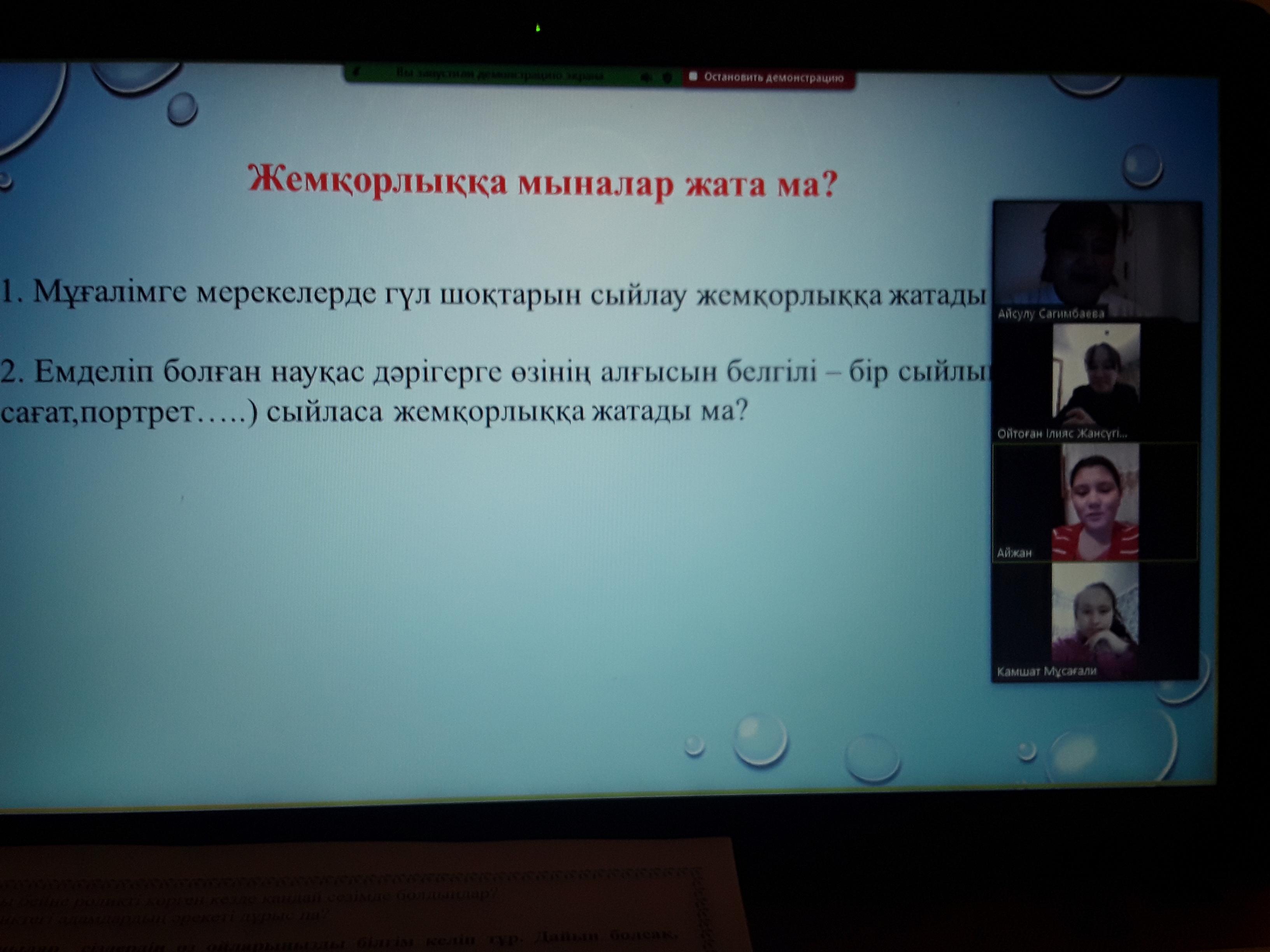 «Жемқорлыққа- жол жоқ» деген тақырыпта адалдық сағаты https://zhansugirov-do-aksu.mektebi.kz/otkrytyj-organ/zhemorlya-arsy-kres/125-zhemorlya-zhol-zho-degen-tayrypta-adaldy-saaty.html https://zhansugirov-do-aksu.mektebi.kz/otkrytyj-organ/zhemorlya-arsy-kres/125-zhemorlya-zhol-zho-degen-tayrypta-adaldy-saaty.html « І. Жансүгіров атындағы орта мектебі, мектепке дейінгі шағын орталығымен» коммуналдық мемлекеттік мекемесінің “сыбайлас-жемқорлық” деген ұғымды түсіндіріп, пайда болу    жағдайлары жайлы түсінік  қалыптастыру.Өз көзқарастарын білдіріп, дүниетанымдарын кеңейту. Өз ойларын еркін жеткізе білу қабілеттерін дамыту,өз мемлекетіне жауапкершілікпен қарау және әділдікке тәрбиелеу. Патриоттық тәрбие қалыптастыру мақсатында «Адал ұрпақ» мектепішілік балалар клубының мүшелерімен ZOOM платформасымен «Жемқорлыққа- жол жоқ» деген  тақырыпта адалдық сағаты өткізілді.