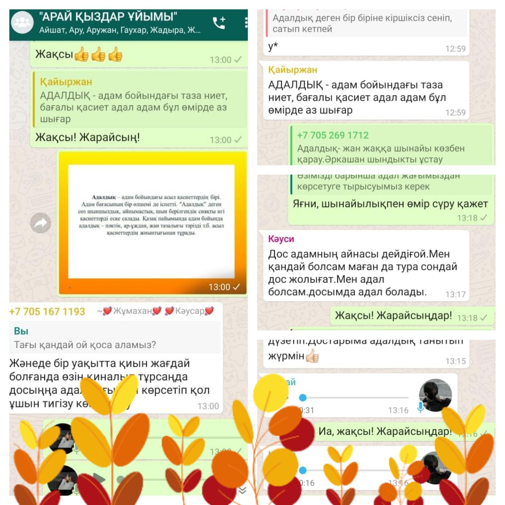 «І.Жансүгіров атындағы орта мектебі, мектепке дейінгі шағын орталығымен» коммуналдық мемлекеттік мекемесінде сыбайлас  жемқорлыққа қарсы мәдениетті қалыптастыру бойынша  «Арай» қыздар ұйымы мүшелерінің  қатысуымен оқушыларға өмірде ата-анаға, досқа адал бола білуге баули  отырып, әр адамның адал ісі мен адамдығы көрінетінін білуге тәрбиелеу, адамгершіліктің жоғары этикалық нормалары екендігіне көз жеткізу; татулық, достық адами қасиеттердің өмірдегі маңыздылығын түсіндіру. Адамдардың өмірінде әділдік пен адалдықтың алатын орны ерекше екені туралы ой - пікірлерін кеңейту; көркем шығармадағы және қоршаған ортадағы достық қарым – қатынастың көріністерін бағалау қабілеттерін дамыту мақсатында  «Арай» қыздар ұйымының жетекшісі А.Ә.Ахметқалидің  ұйымдастыруымен «Адалдық жүрген жерде –адамдық жүреді» деген тақырыпта  пікіралмасу жүргізілді.