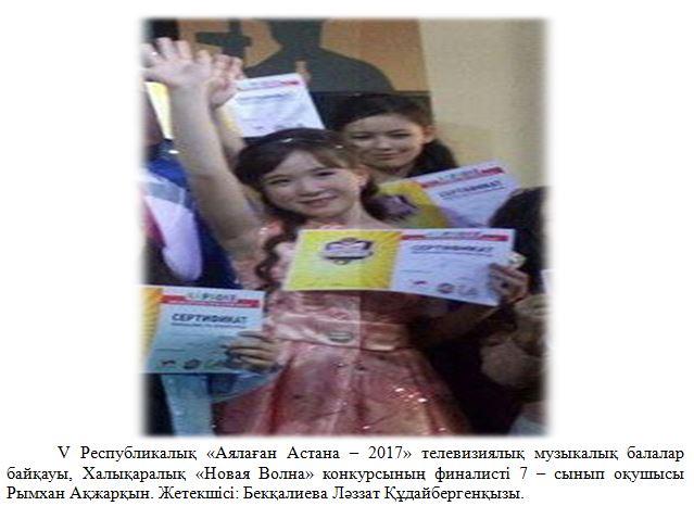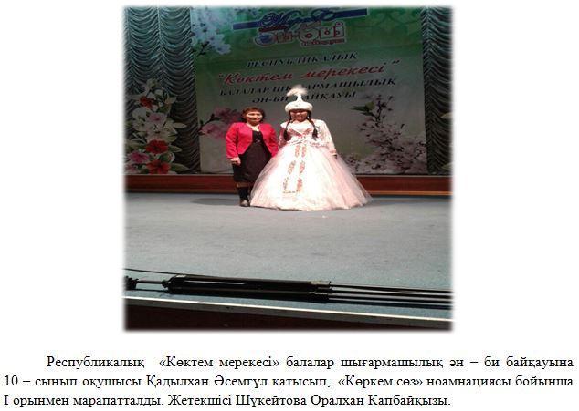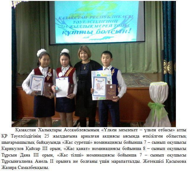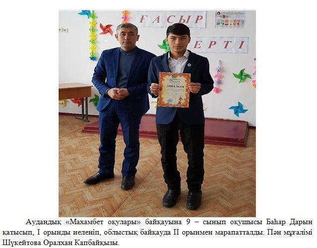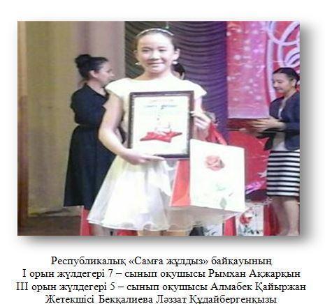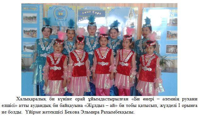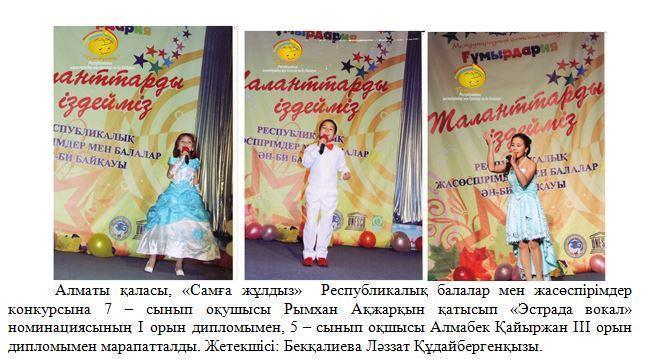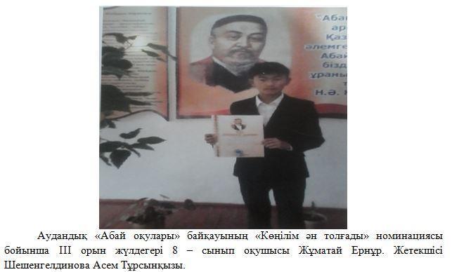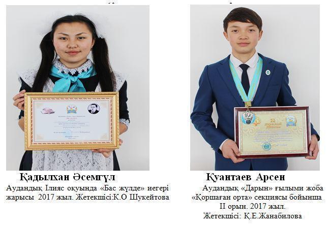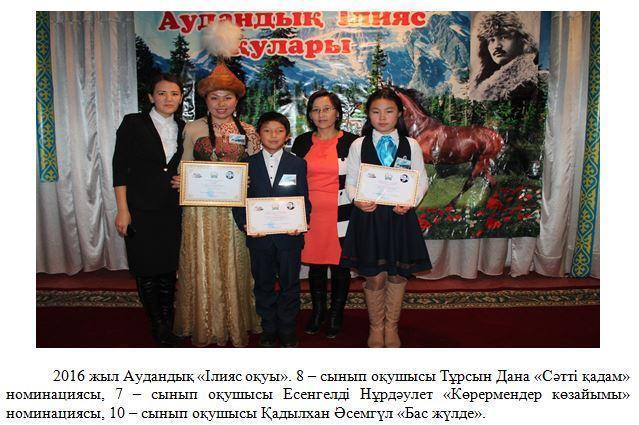 Оқушылар жетістіктері » "Ілияс Жансүгіров атындағы орта мектебі, мектепке дейінгі шағын орталығымен" отдела образования Кербулакского района